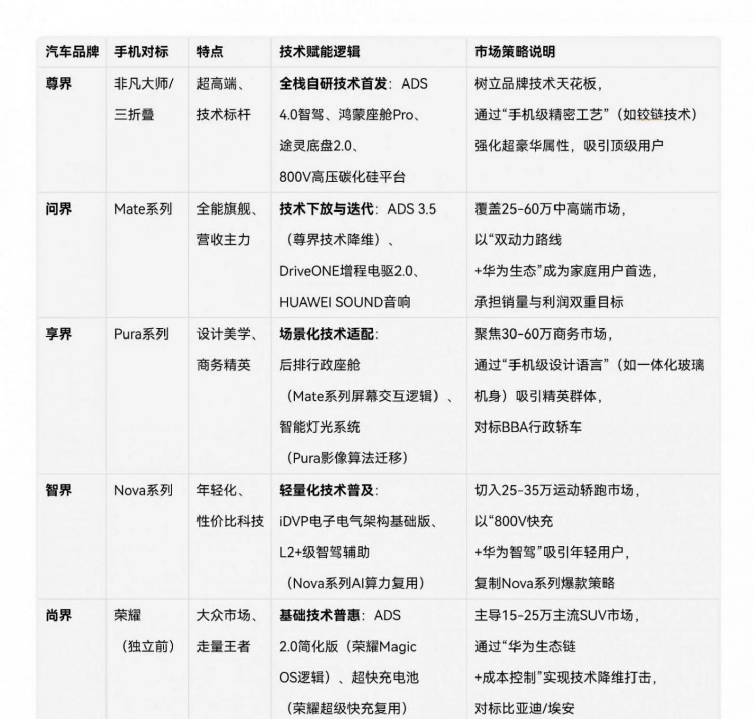 现在造车用“五界”战略,跟五个车企合作。赛力斯负责高端SUV,之前没人敢跟华为深度合作的时候,他们一起做出了问界M5。奇瑞主攻运动型车,北汽做商务旗舰轿车,江淮造百万级豪车,上汽负责便宜车型。每个车企各司其职,华为提供技术,他们负责生产。
