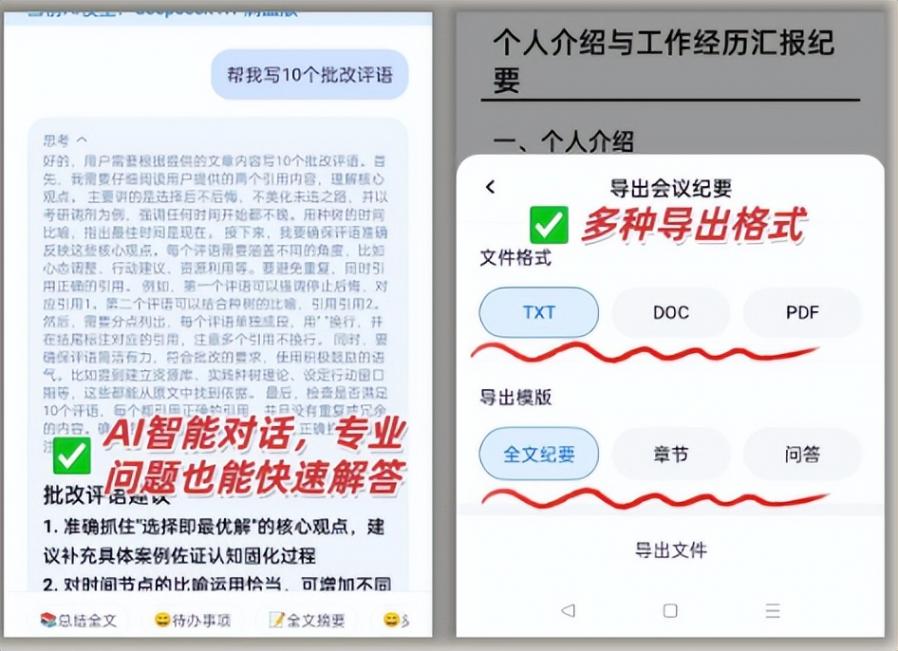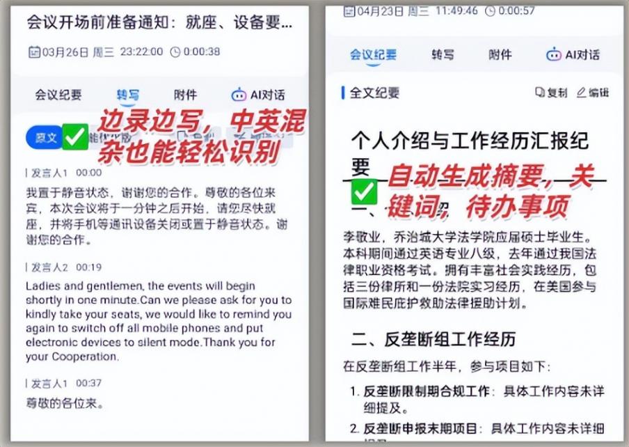 最后分享5个独家技巧,学会了效率翻倍。第一个,自定义发言人标签。除了常用联系人,还能添加“客户A”“技术部”这种临时标签,开会时点一下就能切换,避免分不清谁在说话。第二个,嘈杂环境开智能降噪。办公室开会人多吵?打开录音界面的“降噪”按钮,AI会自动过滤键盘声、空调声,只保留人声,转写准确率能再提5%。第三个,一键导出到WPS。转写完别急着复制,点“导出”选“WPS”,文档会自动带标题、时间、发言人列表,格式规整,直接就能打印。第四个,定时录音+自动转写。提前知道会议时间?在“计划录音”里设置开始和结束时间,手机会自动启动录音,结束后直接转写,就算你临时有事没拿手机也不怕漏录。第五个,实时标记重点。开会时听到关键内容,直接点屏幕上的“标重点”按钮,转写完成后这些内容会自动标红,看摘要时一眼就能找到核心。