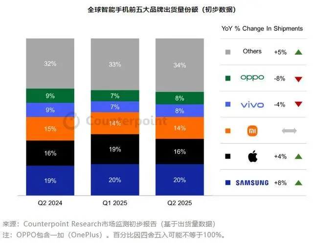 Counterpoint:2025Q2全球智能手机出货量三星、苹果、小米前三