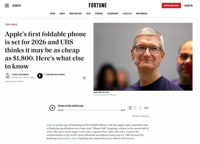 另一消息源报道了瑞银集团(UBS)的一份分析师报告,该报告解析了苹果折叠 iPhone 的定价、物料成本以及供应链合作等关键信息。