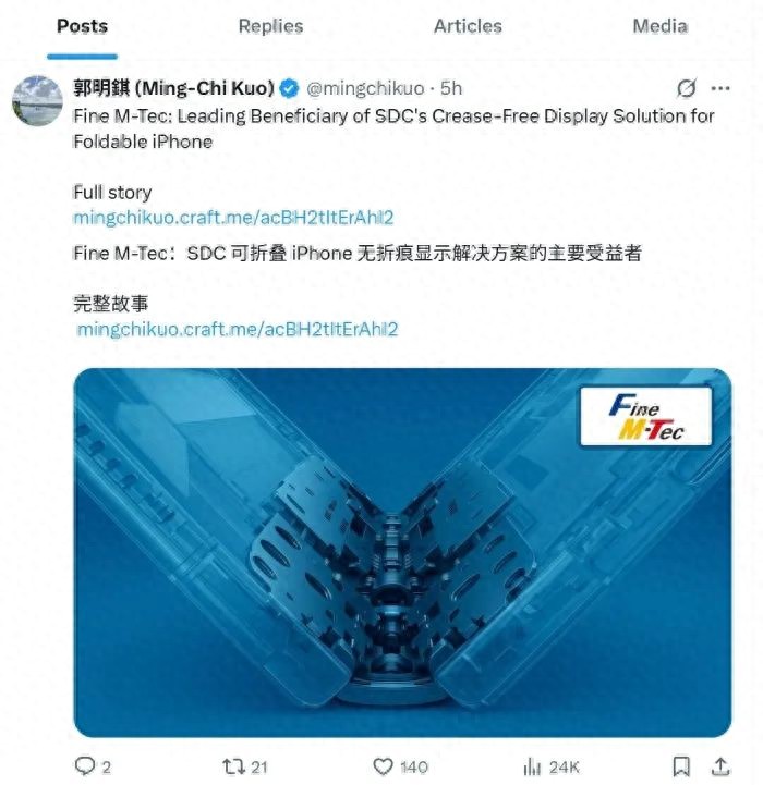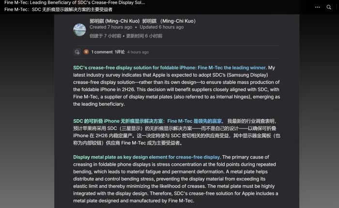 PConline从博文中了解到,苹果放弃了自行设计折叠屏iPhone方案,选择采取三星显示的折叠方案,并与内部铰链供应商Fine M-Tec达成合作。需要注意的是,Fine M-Tec与三星之间的联系颇为密切,三星最新推出的Galaxy Z Fold 7/Z Flip 7系列折叠屏手机,便采用了Fine M-Tec供应的内部铰链。