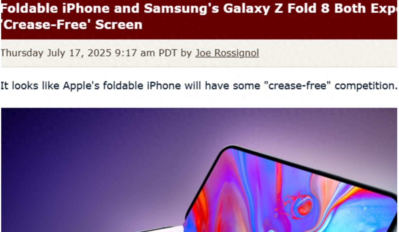 7月18日,据外媒报道,苹果可折叠iPhone将迎来强劲对手,三星Galaxy Z Fold 8也有望采用“无折痕”屏幕。