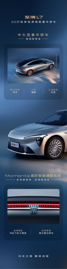 至境品牌要走高端新能源路线,除了轿车,后面还有SUV和MPV。所有车型都基于逍遥架构,和世家一样。今年新能源市场有个最大的变化,就是合资品牌开始注重智能化了。至境L7也一样,激光雷达上车,智驾采用MMT R6飞轮大模型,座舱用高通SA8775P芯片。252kW电机加1.5T专用发动机,增程系统也是顶级的。别克对中国市场很重视,从至境开始,意味要做合资品牌智电化的先行者了。