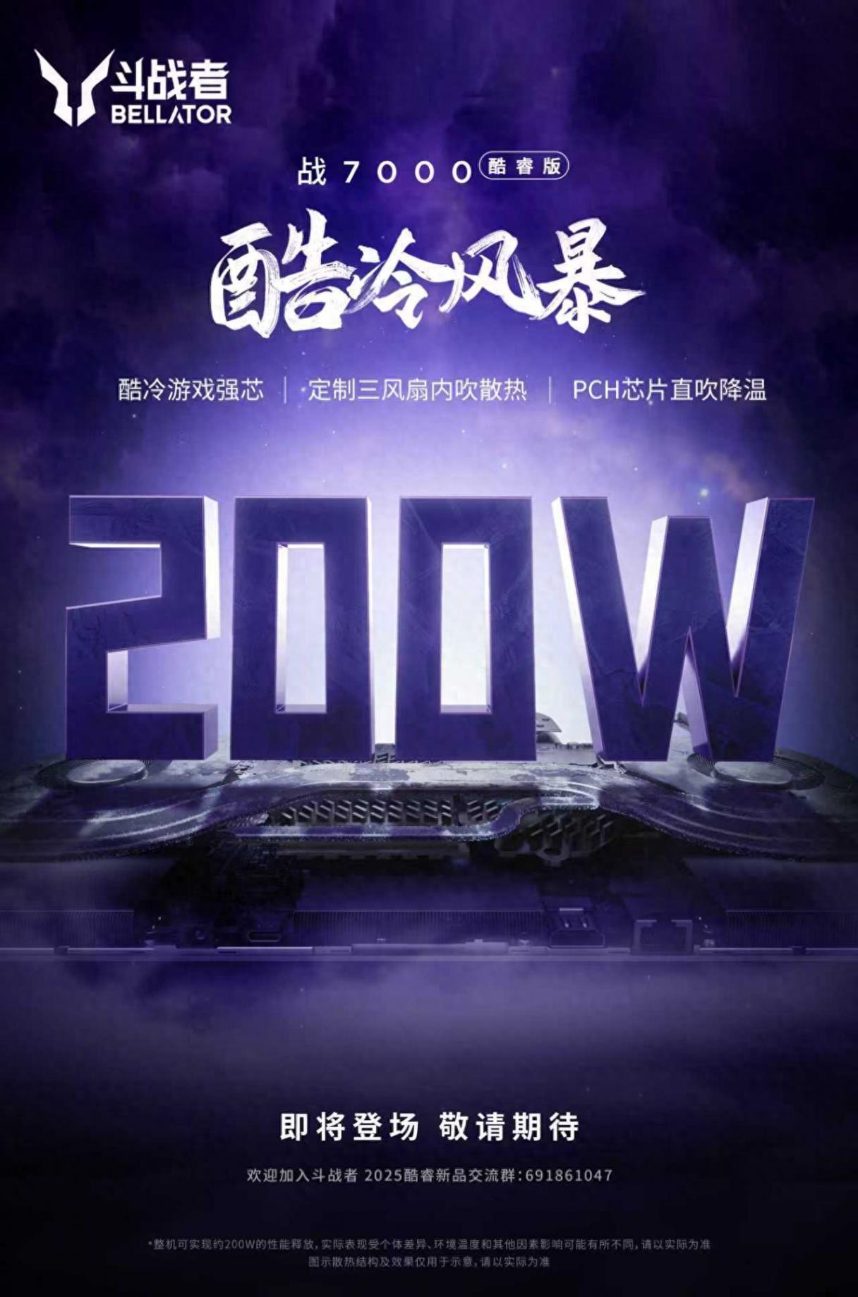 预热显示,战 7000 酷睿版将搭载支持约 200W 性能释放的三风扇“飓风散热”,配备一块 2.5K 分辨率(IT之家注:预计为 2560×1600 分辨率)180Hz 刷新率的“猎光屏”。而从官方宣传图来看,这一机型左右两侧配备了 4 个 USB-A 和 1 个音频插孔,剩余接口应位于尾部。