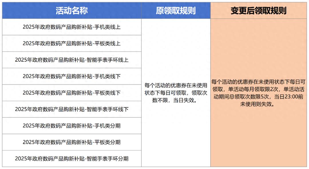 (一)自2025年7月22日10:30起,消费者每人每月可领取单个数码产品活动优惠券不超过2次。