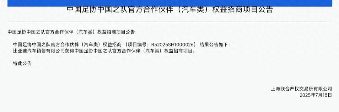 7 月 20 日消息,7 月 18 日,上海联合产权交易所发布公告,比亚迪汽车销售有限公司获得中国足协中国之队官方合作伙伴(汽车类)权益招商项目,这标志着比亚迪与国足正式牵手。上海联合产权交易所官网的一则《中国足协中国之队官方合作伙伴(汽车类)权益招商项目公告》显示了相关消息,落款时间为 7 月 18 日。