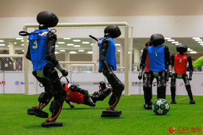 人形机器人足球比赛现场。人民网 克劳迪娅·马尔提尼摄