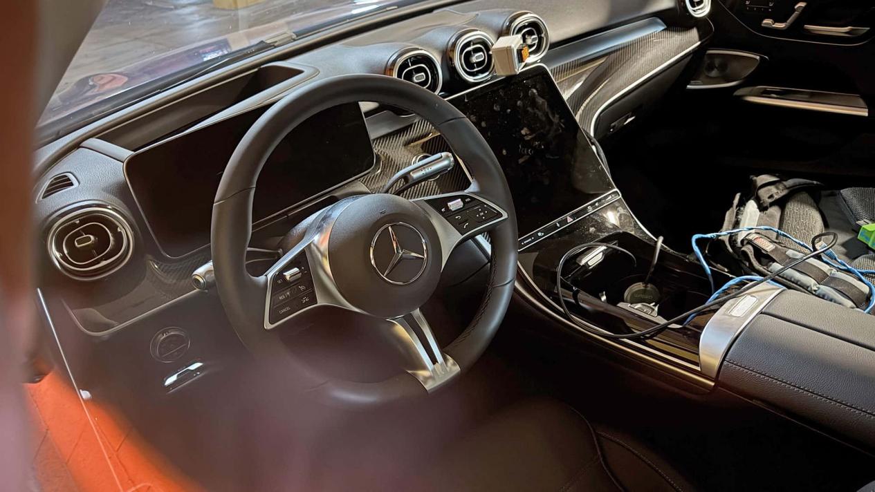 相较外观,新车内饰能看到的变化较少。奔驰依然采用横向布局的数字仪表盘和纵向触控中控屏的组合,屏幕下方的控制区域预计保持不变。不过,新车或许将采用最新版本的MBUX系统,可能会整合MB.OS中的一些元素——这是奔驰计划为所有车型统一开发的操作系统。不过,纯电动系列上配备的大尺寸的MBUX超联屏(MBUX Hyperscreen)应该不会下放到燃油版C级车上。