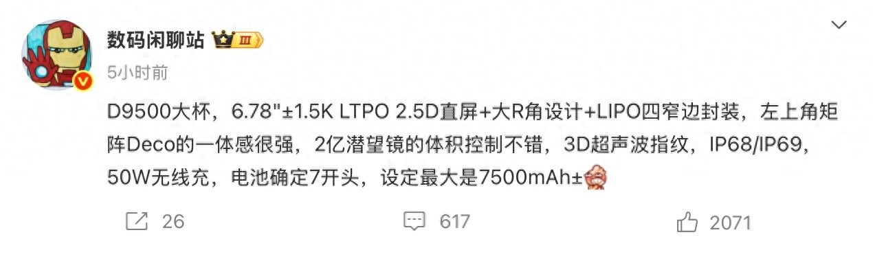 7 月 28 日消息,根据微博数码博主@数码闲聊站 的爆料,某搭载天玑9500 的新手机将配备 6.78 英寸 LTPO 2.5D 直屏,还有大 R 角设计以及 LIPO 四窄边封装,这款新机或将为 OPPO Find X9 Pro。