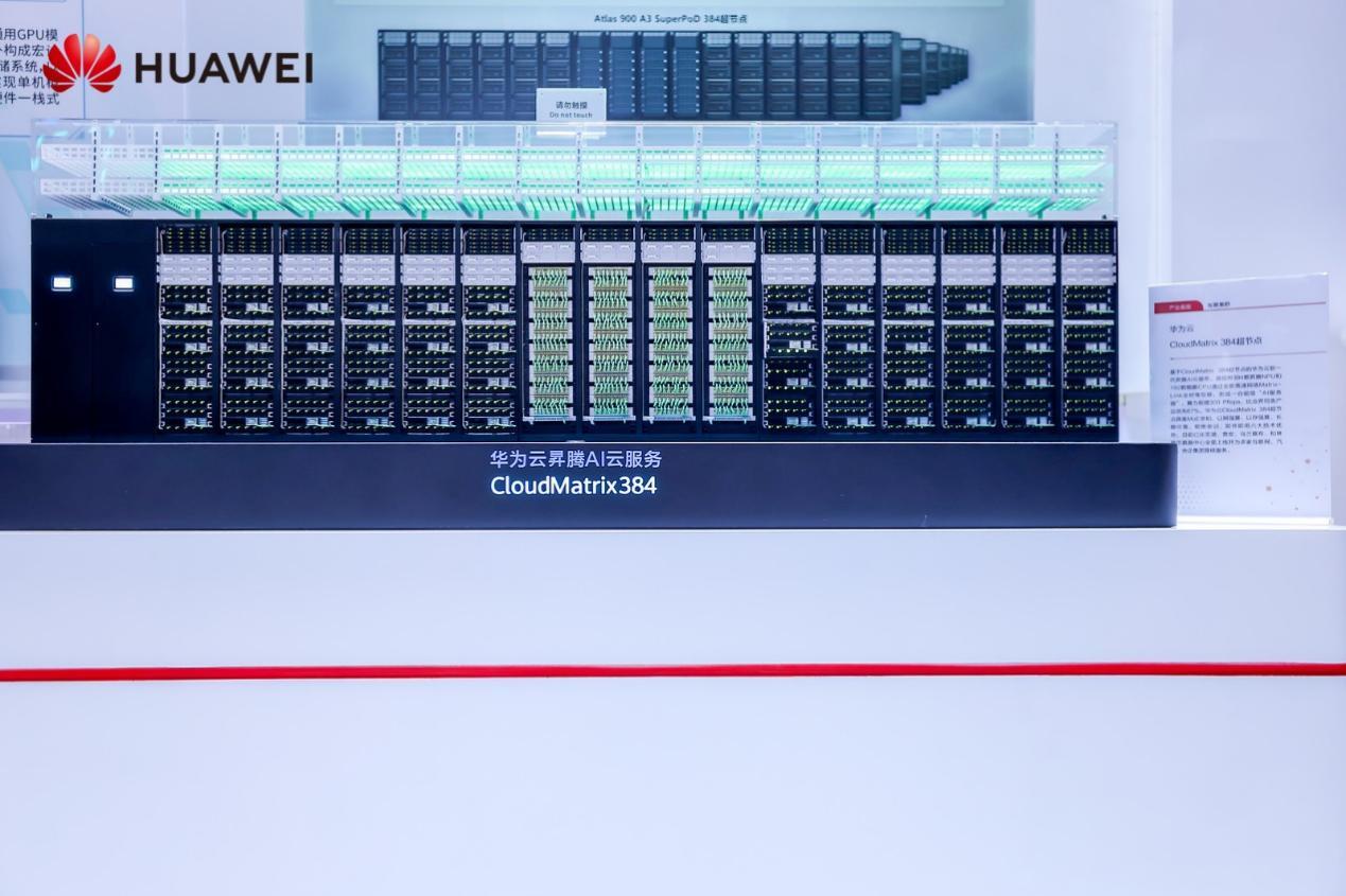 在华为展区中,华为384超节点真机与基于CloudMatrix 384超节点的华为云新一代昇腾AI云服务备受关注,超节点首创将384颗昇腾NPU和192颗鲲鹏CPU通过全新高速网络MatrixLink全对等互联,形成一台超级“AI服务器”,算力规模300 PFlops,成功打破跨机通信带宽性能瓶颈,实现从服务器级到矩阵级的资源供给模式转变。