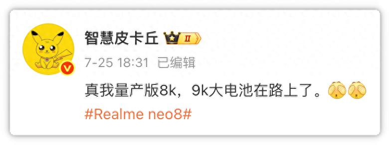 眼看着iQOO搭载8000mAh的性能钢炮也将登场,真我终于坐不住了。7月25日,博主智慧皮卡丘发帖称:“真我量产版8K,9K大电池在路上了。”