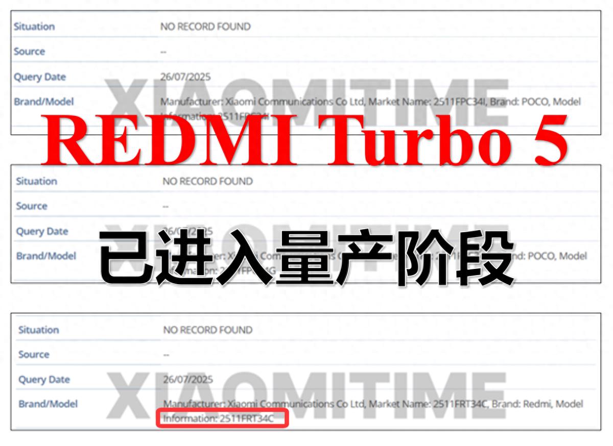 当手机厂商纷纷在旗舰赛道卷得你死我活时,REDMI却悄悄在中端市场继续挖掘。据IMEI数据库最新信息,代号为"2511FRT34C"的REDMI Turbo 5已进入量产阶段,这款全球首发联发科天玑8500芯片的新机,不仅延续了Turbo系列"性能小钢炮"的基因,更以7000mAh超大电池+1.5K直屏的组合,向市场投下了一枚震撼弹。