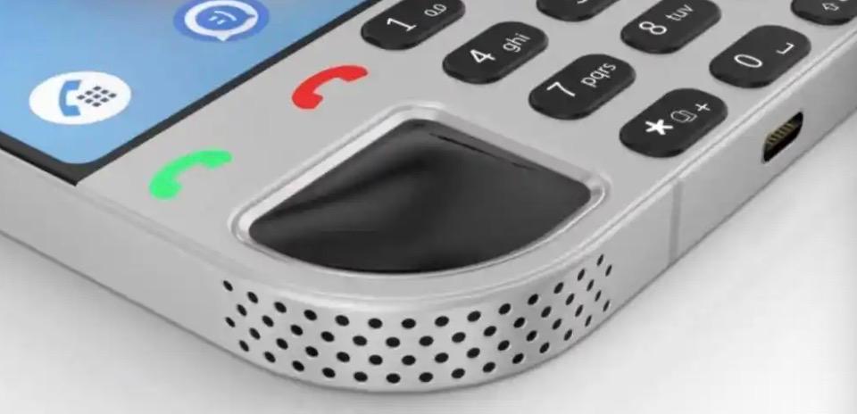 该机采用不对称设计,三个角为直角,唯有左下角为圆弧。仔细看,圆弧处搭载的是扩音板,这意味着该机的声音音量更大、更清晰,对于老年人来说,实用性很强。
