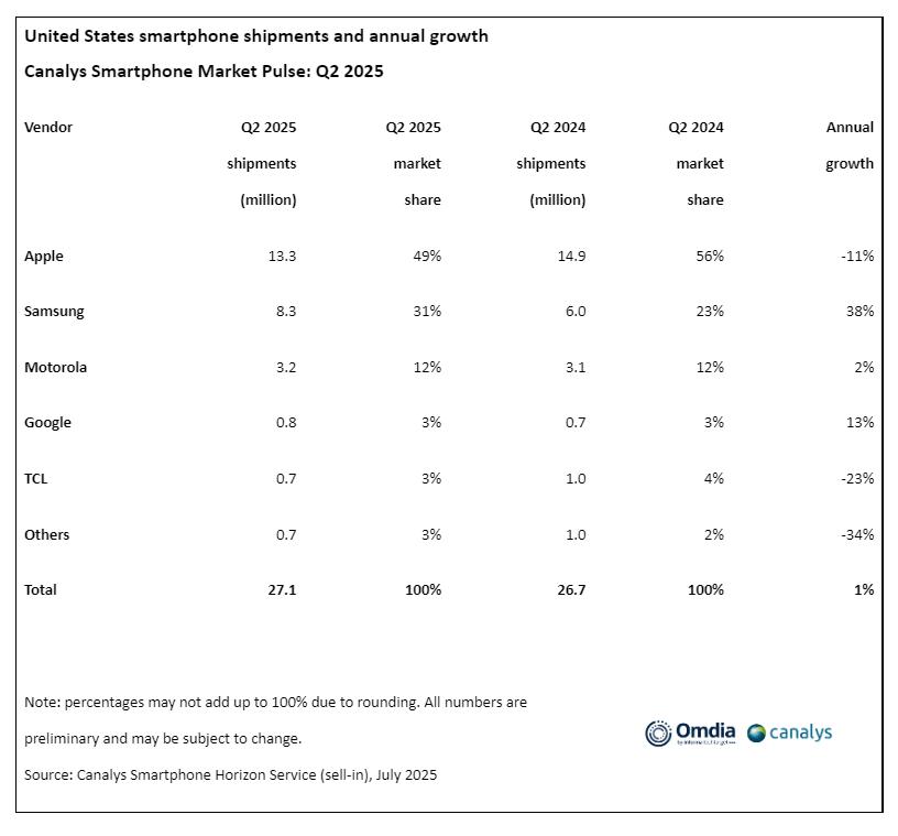 7月29日知名数据调研公司Canalys正式发布了,2025年第二季度北美智能手机市场报告。