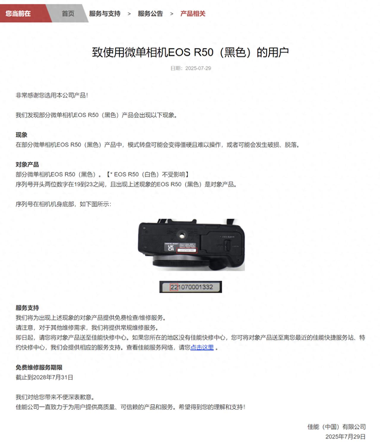 2025年7月29日,佳能发布名为《致使用微单相机EOS R50(黑色)的用户》的公告,表示部分批次的黑色版微单相机EOS R50,模式转盘可能会变得僵硬且难以操作,或者可能会发生破损、脱落。