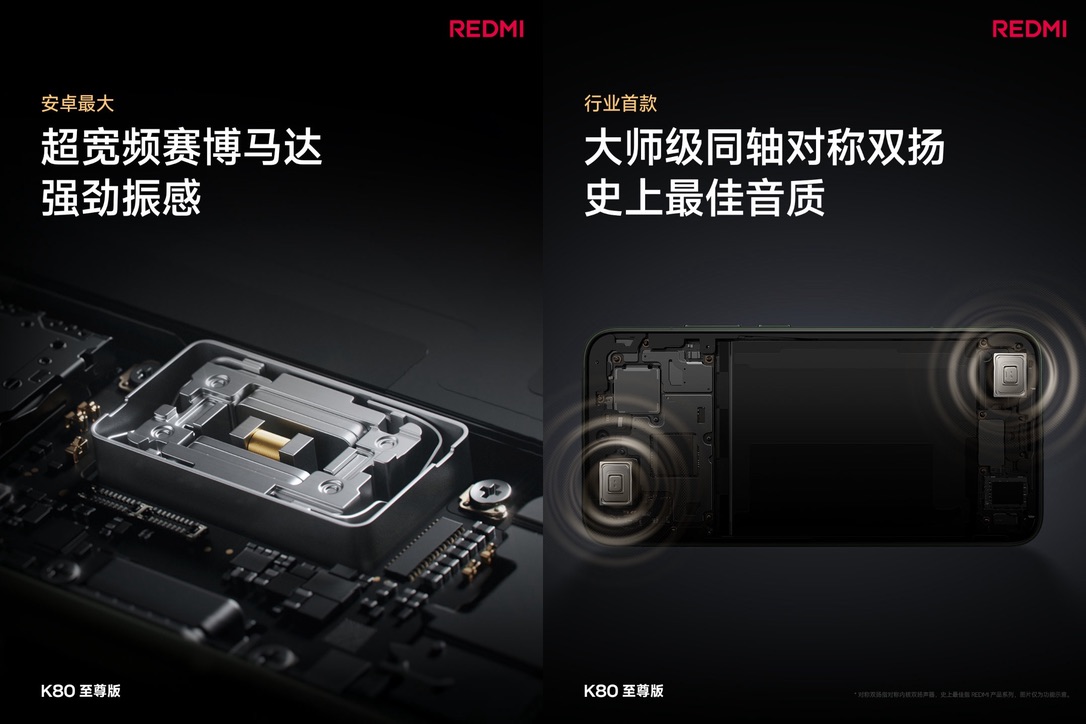 红米K80至尊版最让人惊喜的地方就是周边搭配,NFC、红外遥控、双扬声器、X轴马达、IP68&69防尘防水、超声波指纹识别、双频GPS和金属中框等内容都没有缺席,更狠的是其采用的马达和扬声器非常顶,采用了0916C超大尺寸马达和双1115对称式扬声器。