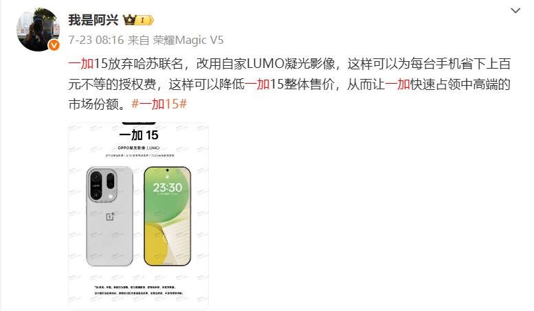 影像方面,各大子系品牌中,只有一加进行了影像联名。而这次一加15终止与哈苏的合作并采用自家的凝光影像系统,是这次一加15最显著的变化。有博主爆料,一加放弃联名后可以为每台手机节省出上百元不等的授权费。