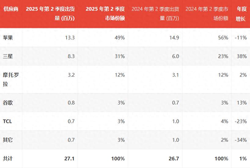 而排名第二的就是三星了,第二季度出货量同比增长了38%,达到830万部,但据悉占出货大头的基本是中低端系列,比如galaxy A55、A35等机型。紧随其后的就摩托罗拉、谷歌以及TCL了,分别占据12%、3%、3%的市场份额,出货量也仅有320万部、80万部,以及70万部。