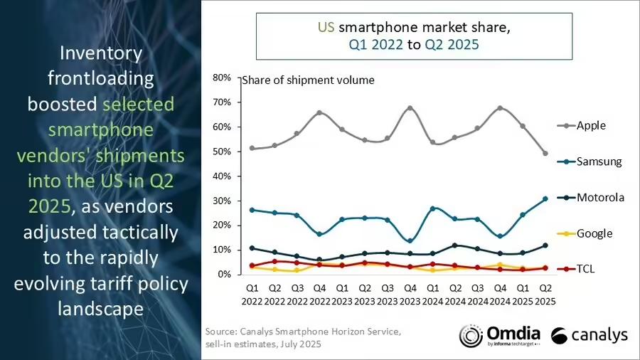 值得一提的是,Canalys还特别指出,2025年第二季度在美国出货的智能手机中,中国组装的手机份额从2024年第二季度的61%大幅下降至2025年第二季度的25%;而印度组装的手机出货量同比增长240%,目前占美国进口智能手机的44%,远高于2024年第二季度的13%。
