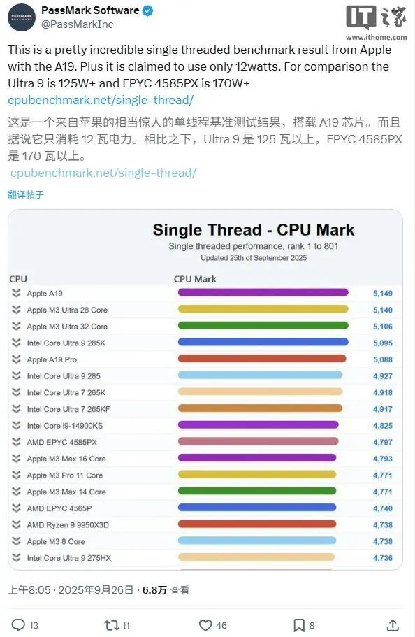 根据最新公布的 PassMark 单核性能排行榜,苹果 A19 芯片已经超越了所有已知芯片(包括桌面级处理器),成为目前全球单核性能最强的 CPU,并且是在被动散热的情况下达成了这一成就。