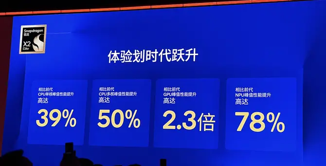 骁龙X2 Elite系列处理器采用了先进的3nm制程工艺,拥有高达18核心的设计,主频达到5GHz。这一代的Qualcomm Oryon CPU在性能上比前代平台提升了高达50%,同时功耗降低了43%。这种性能与能效的双重提升,使得骁龙X2 Elite系列处理器在处理多任务和高负载工作场景时表现出色。