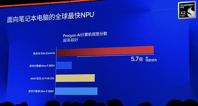 骁龙X2 Elite Extreme通过18核5GHz CPU+80 TOPS NPU+2.3倍性能提升GPU的组合,首次在ARM架构上实现了对x86旗舰(AMD和Intel旗舰U)的全面超越,同时续航提升2-3倍。