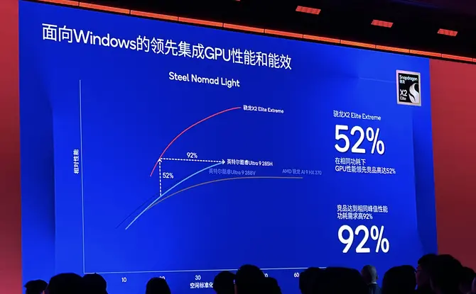 骁龙X2 Elite Extreme的GPU性能比竞品快高达52%,而竞品达到同样峰值性能却需要多消耗92%的功耗。这款处理器支持三路5K 60Hz显示器,支持DirectX 12.2 Ultimate,GPU相比前代平台性能提升高达2.3倍。这些图形性能的提升,为用户带来了更加流畅和逼真的视觉体验。