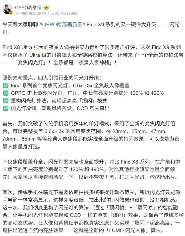 众所周知,影像一直是 @OPPO Find X系列的强项,而根据近期OPPO首席产品官 一加创始人 @刘作虎 、OPPO Find系列产品负责人 @OPPO周意保 陆续晒出的该系列新机的样张和与iPhone 17 Pro的样张对比照以及透露的该机的影像配置来看此次OPPO Find X9系列的影像配置将会进一步提升。日前, @OPPO周意保 再次公布了该系列新机不但会新增AI人像补光系统,而且其配备的“变焦闪光灯”,号称将打造“全焦段CCD闪光人像”,同时还晒出了官配“磁吸闪光灯”。