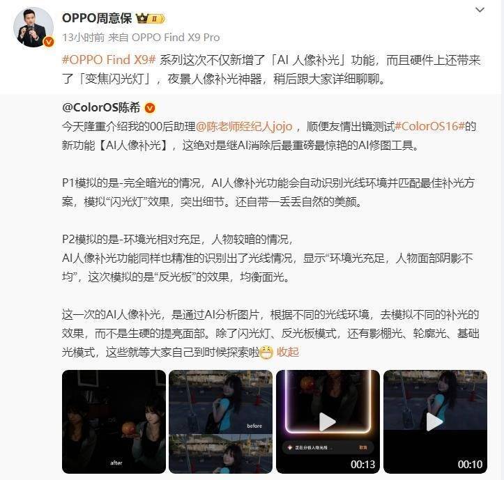 其实,这也是 @OPPO周意保 对ColorOS设计总监 @ColorOS陈希 公布的OPPO Find X9系列将新增「AI 人像补光」功能的解读。@ColorOS陈希 日前晒出了两张对比照和两段视频,并配文解读了新增的AI人像补光系统。据其称,“今天隆重介绍我的00后助理 @陈老师经纪人jojo ,顺便友情出镜测试#ColorOS16#的新功能【AI人像补光】,这绝对是继AI消除后最重磅最惊艳的AI修图工具。