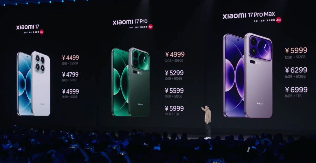 在发布会上,雷军揭晓小米17系列手机的价格:全新小米17系列手机起售价为4499元(12GB+256GB),12GB+512GB版本售价为4799元,16GB+512GB版本售价为4999元;小米17Pro系列手机起售价为4999元,小米17ProMax起售价为5999元。