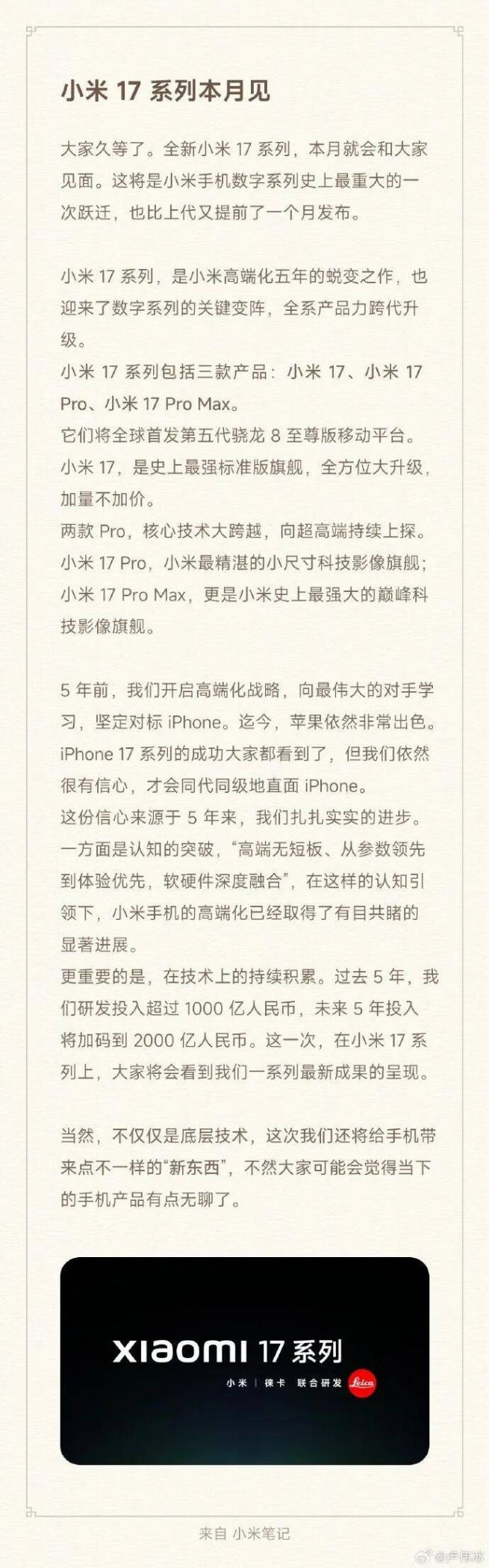 值得注意的一点是,卢伟冰发布该博文显示已来自 Xiaomi 17 Pro Max 手机。