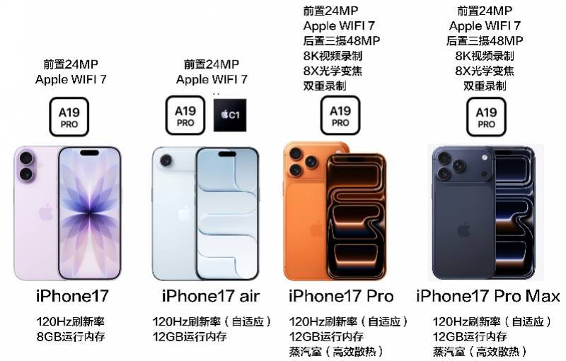 相比往年的产品升级,今年iPhone 17系列在外形、性能上都有了大的更新。iPhone 17采用A19芯片,iPhone Air以及Pro系列搭载A19 Pro处理器。全新的轻薄产品线iPhone Air机身厚度仅5.6毫米,被称为“迄今最薄的iPhone”。Pro系列则是首次实现了“三焦段全覆盖”,4800万像素主摄+超广角+8倍光变潜望长焦组合,支持全焦段8K视频录制。