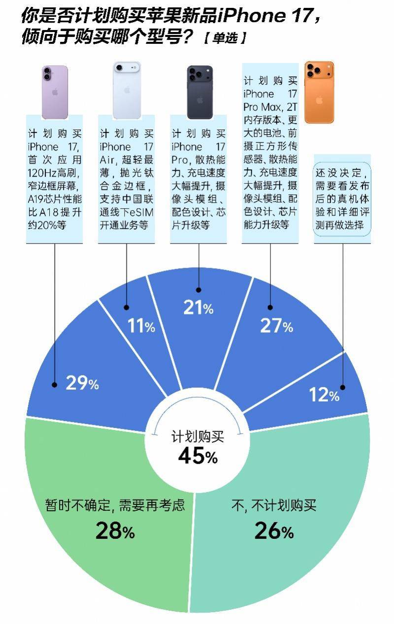 今年的苹果发布会上,蒂姆·库克重新提起了乔布斯的那句名言,“设计不止关乎外观和感觉,更在于如何运行。”从调研反馈来看,还是有不少人愿意为今年的设计买单,有45%的受访者表示计划购买iPhone 17系列,28%的受访者认为还需要再考虑。