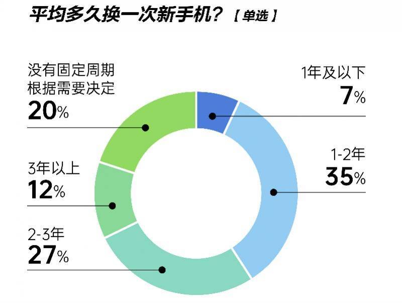 从换机频率来看,大多数受访者的换机频率在1-3年。根据调研结果,35%的受访者选择1-2年换一次手机,27%的受访者2-3年换一次手机,还有12%的受访者换手机的频率在3年以上,以及7%的受访者换手机频率在1年以内。
