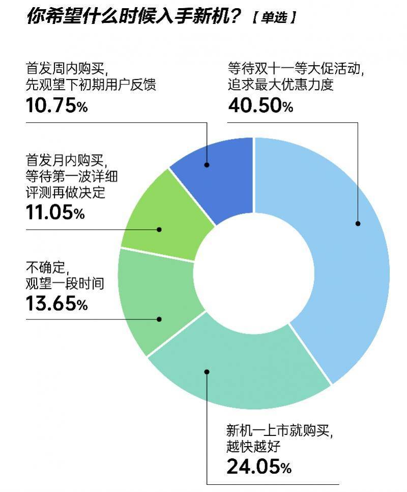 从调研来看,有近半的受访者计划抢购iPhone17首发产品。对于购买时机,有24.05%的受访者表示新机一上市就购买,越快越好;还有10.75%的受访者希望首发周内购买,先观望下初期用户反馈;11.05%的受访者希望在首发月内购买,等待第一波详细评测再做决定;还有40.50%的受访者想等待双十一等大促活动,追求最大优惠力度。比起抢购首发,还是有不少消费者更愿意追求性价比,希望在最优惠的时候买。