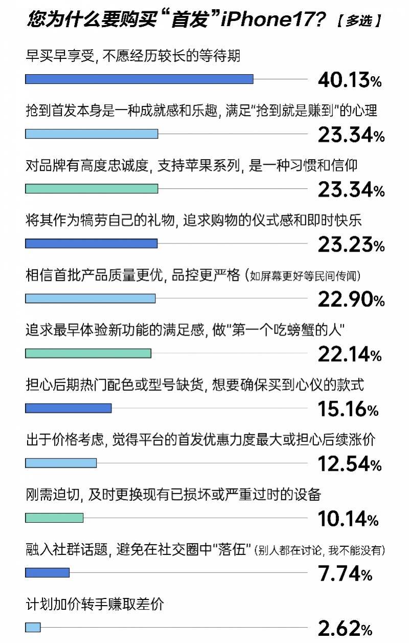 想要购买首发的受访者中,有40.13%的受访者理由是“早买早享受,不愿经历较长的等待期”,23.34%的受访者理由是“对品牌有高度忠诚度,支持苹果系列,是一种习惯和信仰”,还有23.34%的受访者抢购首发是因为“抢到首发本身是一种成就感和乐趣,满足‘抢到就是赚到’的心理”,也有23.23%的受访者是因为“将其作为犒劳自己的礼物,追求购物的仪式感和即时快乐”。