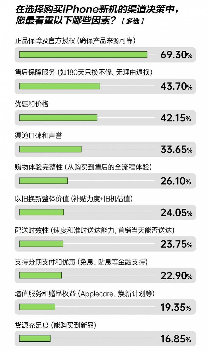 在选择购买iPhone17系列新机时,正品保障及官方授权(确保产品来源可靠)成为消费者最在意的点。调研显示,69.30%的受访者选择渠道时最看重正品保障及官方授权,43.70%的受访者则是看重售后保障服务,如180天只换不修、无理由退换,42.15%的受访者看重优惠和价格,33.65%的受访者看重渠道口碑和声誉。