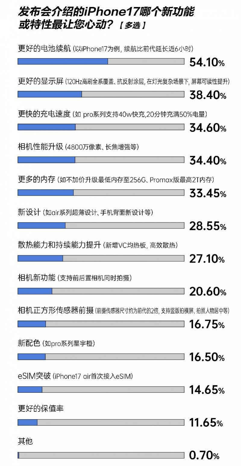 对于今年的新机,电池续航、显示屏、充电速度等是消费者最满意的升级点。54.10%的受访者认为对iPhone17系列新机最心动的特性是续航升级,还有38.40%的受访者认为是更好的显示屏,34.69%的受访者看中的是更快的充电速度,33.45%的受访者看中的是更多的内存,被不少网友诟病的新配色(如pro系列星宇橙),也获得了16.50%的受访者的支持。