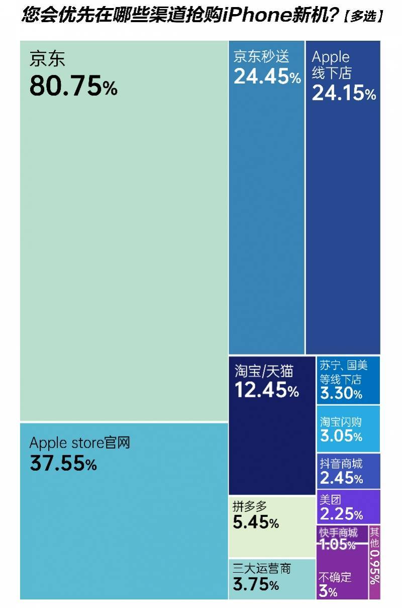 在受访者对各个渠道的优先级排序中,排名前五的依次是京东、Apple store官网、京东秒送、淘宝/天猫,以及Apple线下店。
