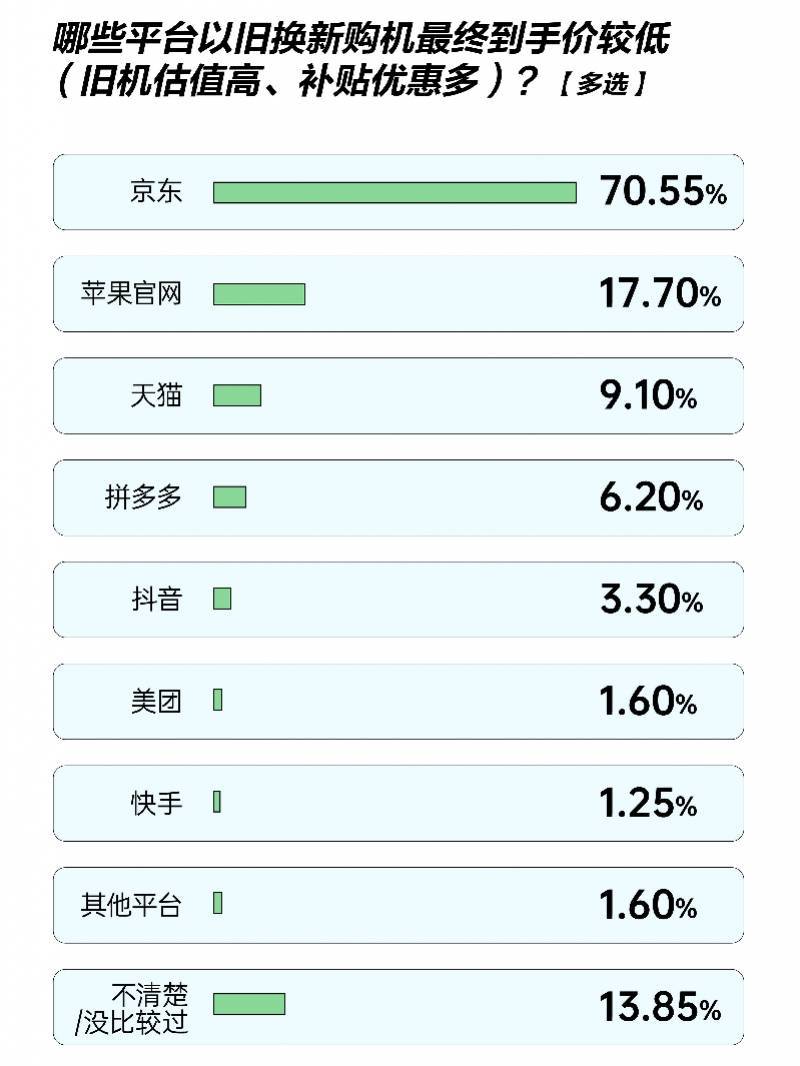 在各个平台的选择上,有70.55%的受访者认为在京东以旧换新补贴及综合优惠最多,最终新机到手价最低,还有17.70%的受访者认为是苹果官网。另外,75.4%的受访者认为京东平台“使用体验最流畅,操作最简单”。综合来看,80.2%的人表示,使用“以旧换新”购买新机,会优先选择京东。
