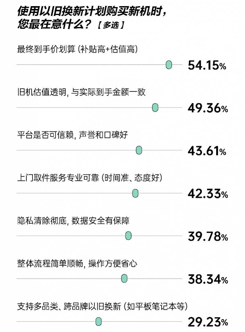 在购买新机的方式中,有69%的受访者选择直接购买,31%的受访者选择通过以旧换新计划购买。对于以旧换新渠道,54.15%的受访者最看重的是最终到手价划算,也就是补贴高+估值高;49.36%的受访者看重的是旧机估值透明,与实际到手金额一致;43.61%的受访者看重平台是否可信赖,声誉和口碑好,还有39.78%的受访者看重隐私清除彻底,数据安全有保障。