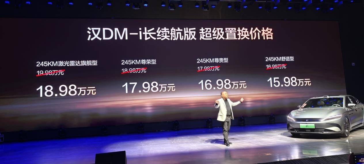 10月11日晚,比亚迪汉家族加推长续航版车型,汉DM-i长续航版共推出4个版型,超级置换价区间为15.98万-18.98万元,汉EV长续航版则推出3个版型,超级置换价区间为17.38万-20.58万元。