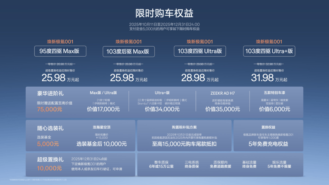 焕新极氪001的价格为26.98-32.98万起,叠加置换权益的话,还能再减一万。