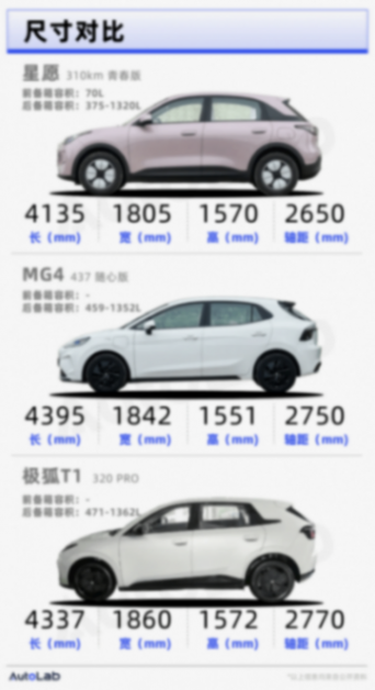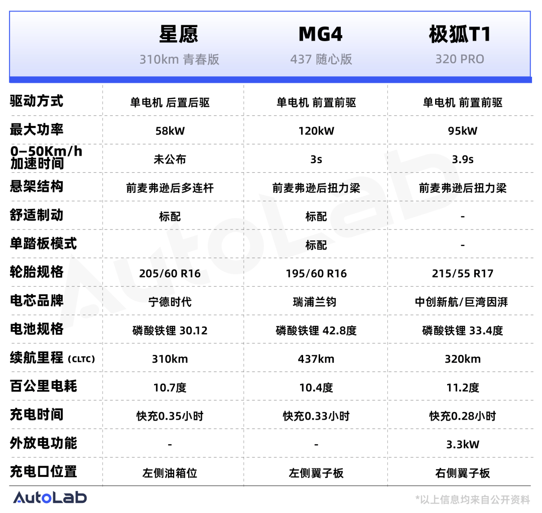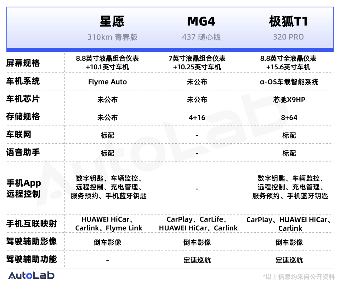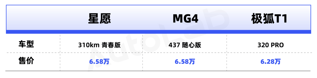 参考现款星愿最受关注的是最入门的版本,我们选取了MG4和极狐T1的“丐版”来进行对比。
