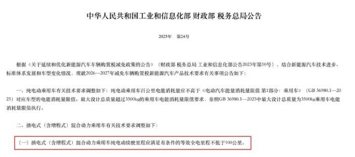 与此同时,政策的调整更暴露了大电池策略的投机性。近日,工信部等三部门联合公告的2026~2027年新能源汽车购置税减免技术要求,明确提高了插混车型的准入门槛,那些纯电续航低于100公里的车型将被排除在减免范畴之外。这意味着车企此前“堆电池”的部分动力,竟是为了迎合政策红利,而非真正满足用户需求。