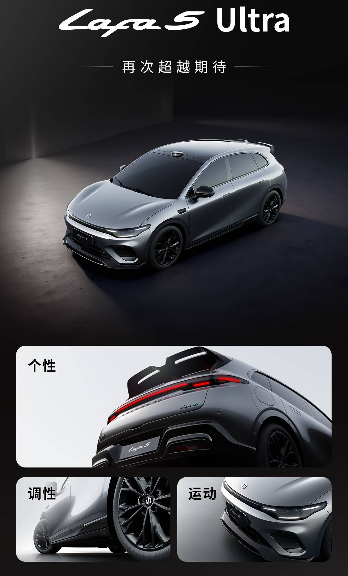 值得一提的是,零跑Lafa5还会推出Ultra版,前后包围处加入运动套件,并配备分段式后扰流板。