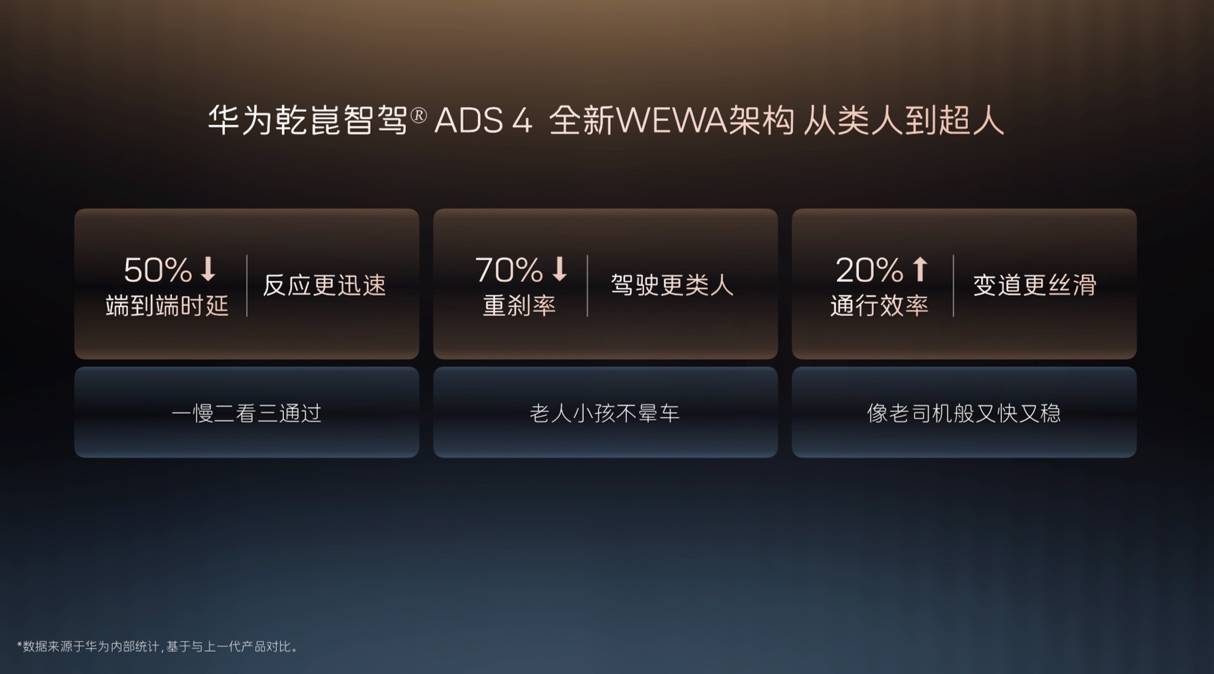 在软件层面,它搭载 华为乾崑ADS 4 基于 WEWA 世界模型的智能驾驶系统,号称“从模仿人类到超越人类”的决策进化。系统通行效率提升20%、重刹率降低30%(或更高)以及端到端时延缩短50%。