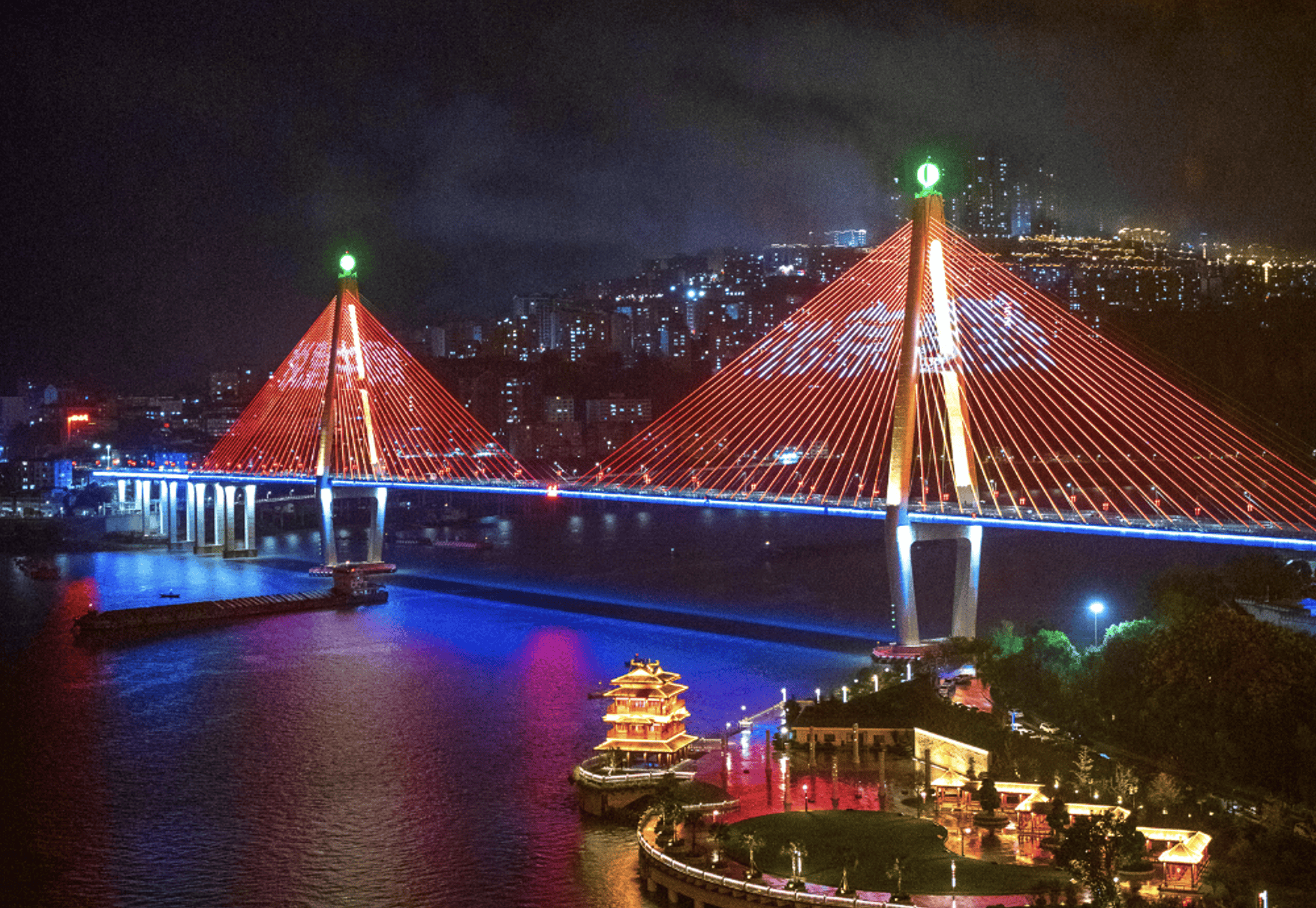 入夜后,巴东长江大桥被点亮,巨大的“北京越野”和“悦野·中国”灯光倒映在江面上,连续闪耀了五个夜晚,场面非常壮观。