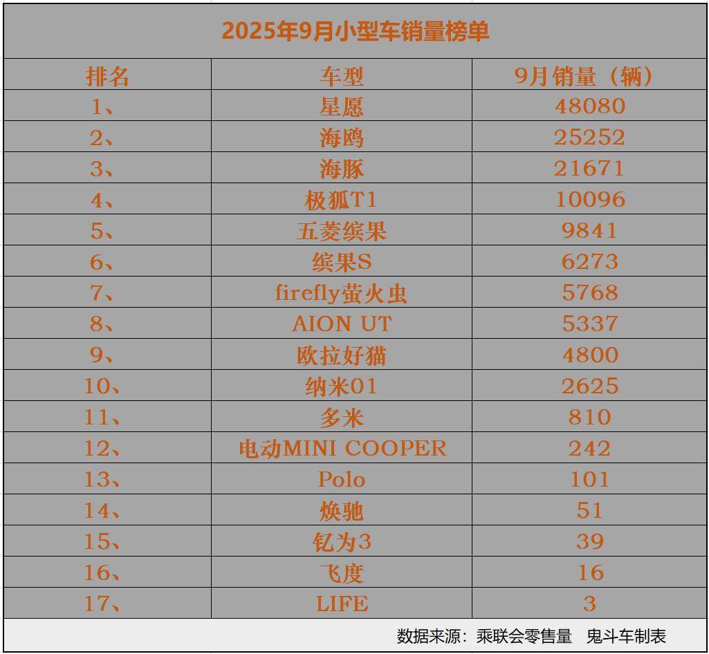 在销量上体现得更明显,日前,乘联会发布9月车市零售销量数据,鬼哥整理出9月小型车销量榜单,可以看到,这一市场可谓有人欢喜有人忧,9月共有四款小型车销量过万,都是纯电小型车,接下来,看看车型具体的销量表现与排名。