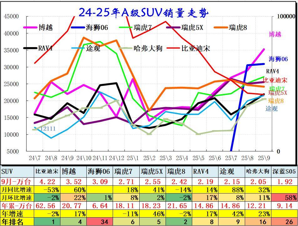 主流SUV市场格局迅速变化,比亚迪和吉利、长安、奇瑞的SUV 表现超强,实现了自主SUV的国内外全面突破。